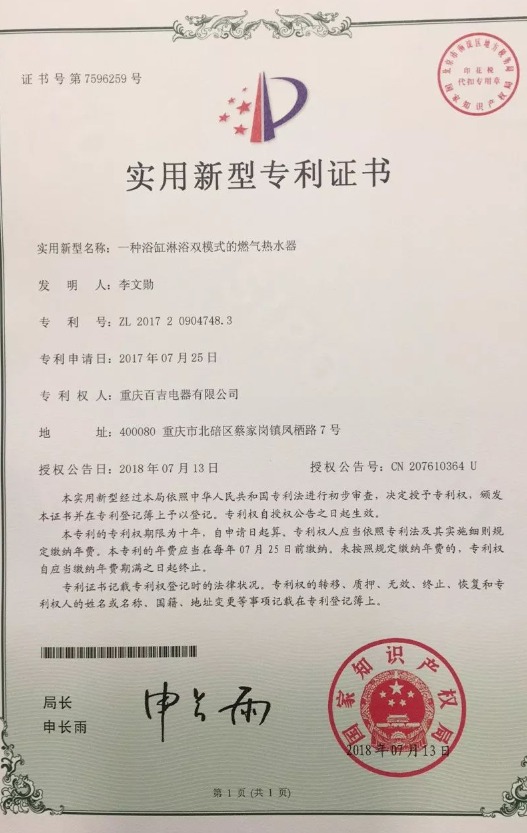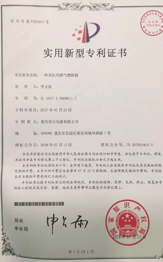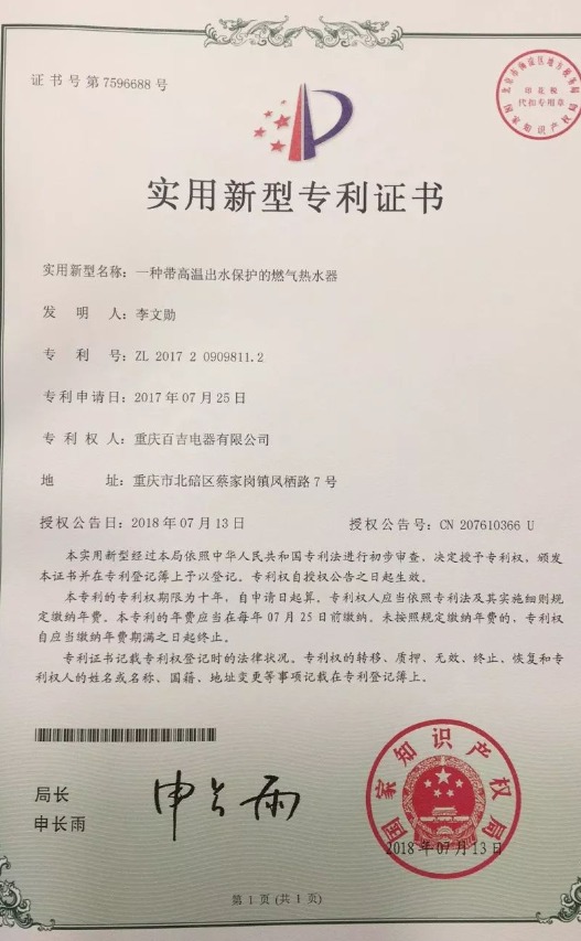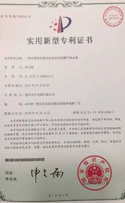 近日,百吉自主研發的多項技術通過了國家專利審查,喜獲授權!獲得專利的技術名稱分別是:一種高抗風燃氣燃燒器、一種帶高溫出水保護的燃氣熱水器、一種浴缸淋浴雙模式的燃氣熱水器以及一種實現浴缸模式自動關水的燃氣熱水器。