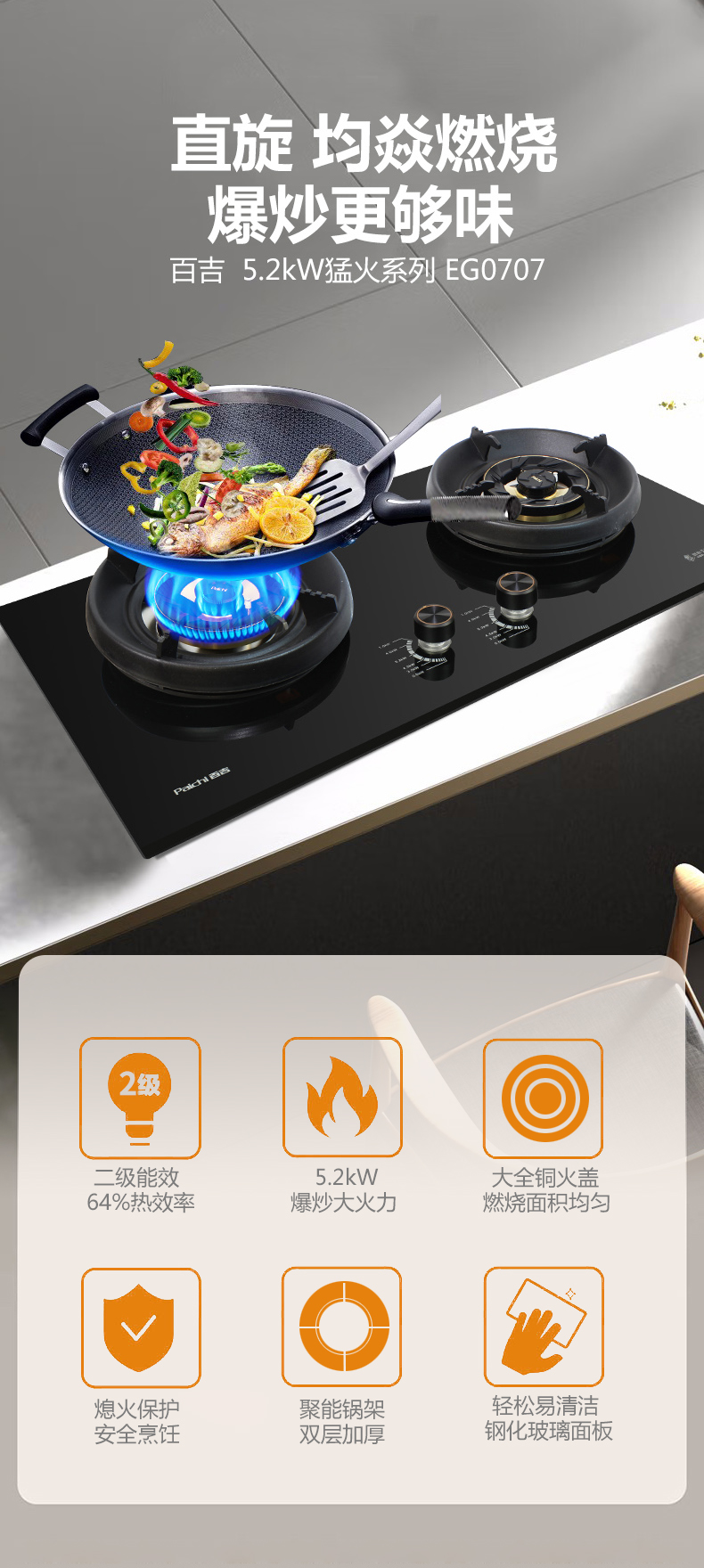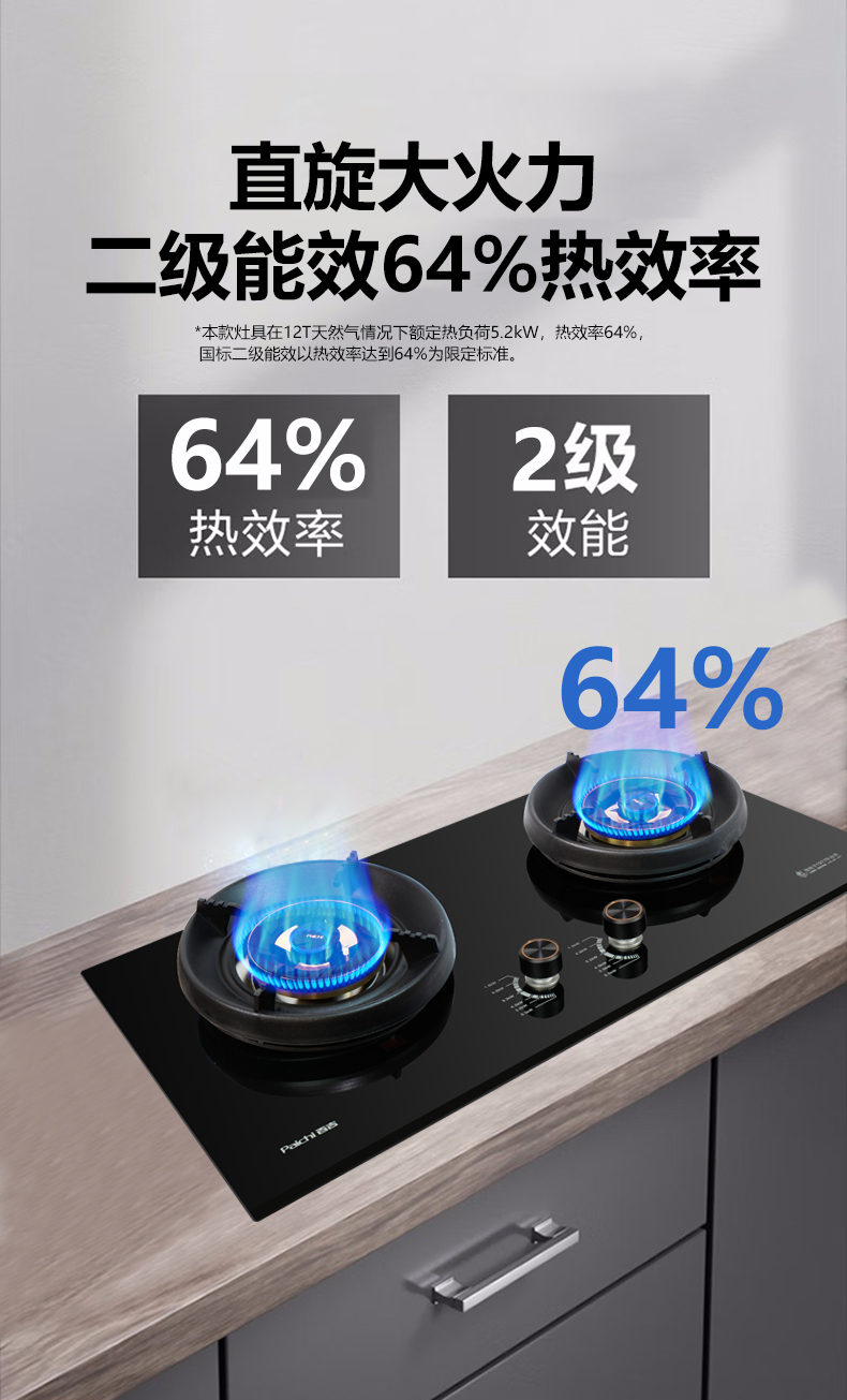 直旋大火力,5.2kW聚能猛火灶,64%高熱效率